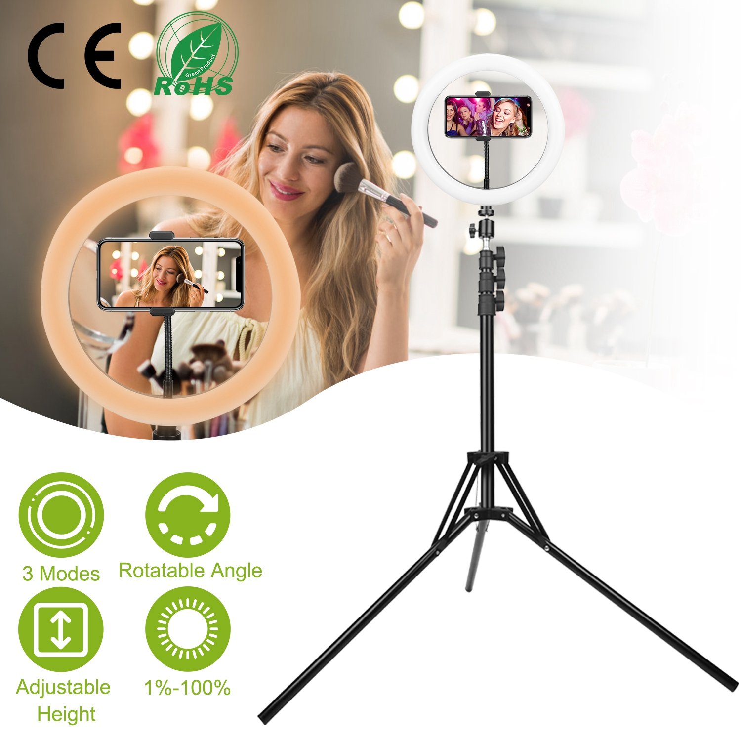 Are you looking for a powerful and reliable ring light for makeup, real-time video, self-portrait, video shooting, beauty salon, live streaming and more on the market? Our 10" LED ring light is the fittest one for you. It can provide ultra-brightness by adopting 120pcs premium LED lamp beads. And it is for a proper color temperature adjustment from 3000K to 6500K. Besides, its 360°horizontally rotatable and 180°vertically adjustable feature allows you to choose the right light illumination angle conveniently. The stable tripod stand can be extended from 34.25inches to 82.68inches for different needs and folded into 19inches for convenient storage.